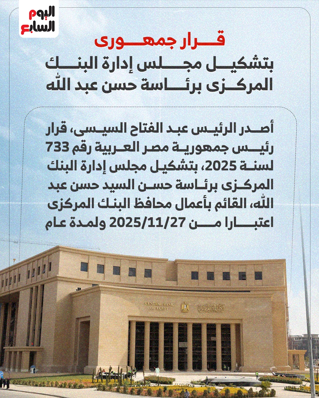 أصدر السيد الرئيس عبد الفتاح السيسى، القرار رقم 733 لسنة 2025، بتشكيل مجلس إدارة البنك المركزى برئاسة السيد حسن السيد حسن عبد الله، القائم بأعمال محافظ البنك المركزى،…