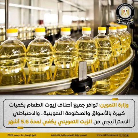أكدت وزارة التموين والتجارة الداخلية أن جميع أصناف زيوت الطعام متوفرة بكميات كبيرة في السوق المحلي، سواء الزيوت التموينية أو الزيوت الحرة، وأن ما يُثار حول وجود نقص في الزيوت بالأسواق غير صحيح، موضحةً أن الاحتياطي الاستراتيجي من الزيت التمويني، سواء المتاح داخل البلاد أو من خلال التعاقدات الجارية، يكفي لتلبية احتياجات المواطنين لمدة 5.6 شهر، بما يعكس استقرار الموقف التمويني وتأمين احتياجات السوق.