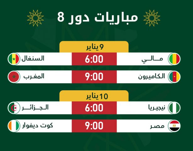 ويضم الدور ربع النهائي لبطولة كأس الأمم الإفريقية 2025، 8 فرق هي المغرب، مصر، الجزائر، الكاميرون، السنغال، نيجيريا، مالي وكوت ديفوار.