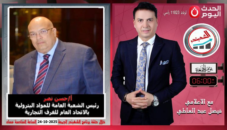 يستضيف الإعلامي فيصل عبد العاطي، خلال حلقة الجمعة القادمة 24-10-2025 من برنامج الشهبندر المُذاع على قناة الحدث اليوم الفضائية في تمام الساعة السادسة مساءً حسن نصر رئيس الشُعبة العامة للمواد البترولية بالاتحاد العام للغرف التجارية ، وحلقة خاصة عن هذا القطاع وأهم مقترحات تطويره، ورؤية الشُعبة للتنمية ودعم الاستثمارات في قطاعها في ظل الخطة التنموية العامة للدولة ورؤيتها 2030 .