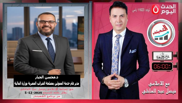 يستضيف الإعلامي فيصل عبد العاطي، خلال حلقة بعد غدٍ الجمعة 5-12-2025 من برنامج الشهبندر المُذاع على قناة الحدث اليوم الفضائية، في تمام الساعة السادسة مساءً، الدكتور محسن الجيار، مدير عام خدمة المُمولين بمصلحة الضرائب المصرية بوزارة المالية، وحلقة حول: دليل الخدمات المُصدرة (التفاصيل الكاملة عن الخدمات المُصدرة) وتعليمات المقاصة والنظام الضريبي المُبسط والفاتورة الإلكترونية والإيصال الإلكتروني.