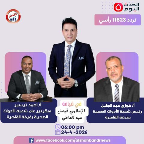 يستضيف الإعلامي فيصل عبد العاطي، خلال حلقة غدٍ الجمعة 24-4-2026، من برنامج “الشهبندر” المُذاع على قناة الحدث اليوم الفضائية، في تمام الساعة السادسة مساءً، فوزي عبد الجليل رئيس شُعبة الأدوات الصحية بغرفة القاهرة وأحمد تيسير سكرتير عام الشُعبة ، وحلقة خاصة عن سوق هذا القطاع مع الظروف الاستثنائية العالمية الحالية وآخر المستجدات والتحديات بهذا القطاع ، ونظرة الشُعبة المستقبلية والأسعار ، وحالة السوق وما وصلت له هذه الصناعة محليًا وتصديريًا ، ومدى الطلب عليها.